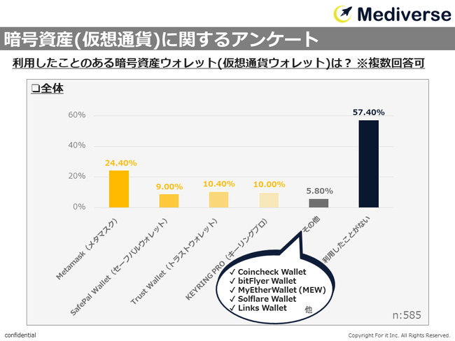 暗号資産ウォレット(仮想通貨ウォレット)利用経験について、約25%が「Metamask(メタマスク)」と回答するも、過半数は利用経験なし