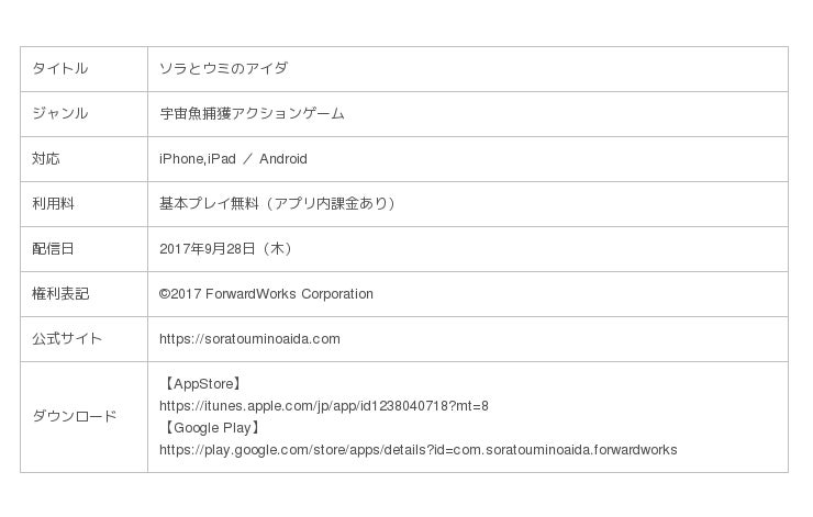 株式会社フォワードワークス(以下、FW)は、スマートフォン向け宇宙魚捕獲アクションゲーム『ソラとウミのアイダ』において、2018年6月26日(火)より、新イベント「襲撃!イケスのヤド御殿!!」を開催いたします。今回のイベントでは、プレイヤーと共に戦う「守護神」の力を強化するアイテム「宝珠」の高グレード品が報酬で手に入ります。また、本イベント中に特別な力を発揮する新たな守護神も登場します。