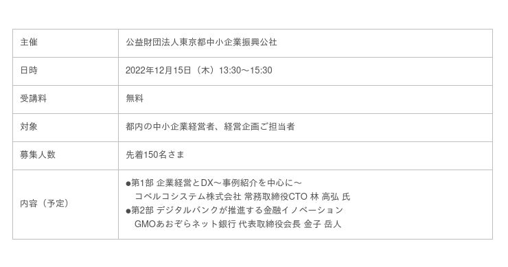 GMOあおぞらネット銀行(以下、当社)は、公益財団法人東京都中小企業振興公社(以下、東京都中小企業振興公社)が2022年12月15日に開催する「ポストコロナに向けた企業変革推進セミナー」に、会長の金子が登壇することが決定しましたのでお知らせいたします。