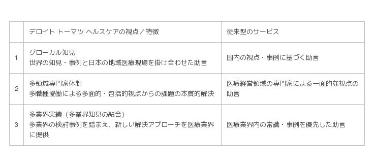 デロイト トーマツ ヘルスケアでは以下3つの視点を軸に、従来型のサービスでは賄えなかった視点を加味し、地域医療の課題解決に取り組んでいきます。セミナー開催などを通して積極的に情報・アプローチの普及を図り、地域医療の持続的な提供に貢献していくことを目指します。