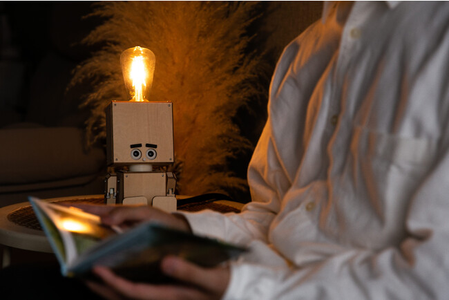 「LIGHTONY」(ライトニー)は、「おはよう」、「おやすみ」、「ライトニー起きて!」などと声をかけると、頷いてライトをつけたり消したり、ユーザーの手元をやさしく照らしてくれるライトロボットです。ベッドサイドやソファサイドに佇み、ライトを点けたままうっかり眠ってしまっても、うたた寝の表情で一緒に寝落ちしてくれます。