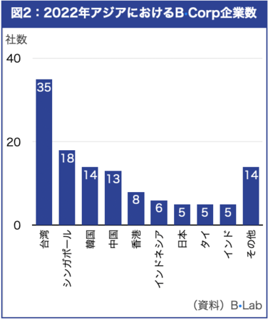 中でも、B Corp企業認証というサステナビリティ認証が特に重視されている。B Corp企業認証とは、アメリカの非営利団体「B Lab」によって始まって、環境や社会の持続可能性を考慮し社会への説明責任を引き受ける企業に与えられる認証のことで、台湾においてB Corp企業認証取得企業数はアジア全体において3割程度を占めて1位であり、現在35社がある(2022年12月時点)。