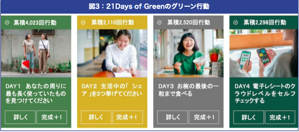 緑藤生機の魅力というと消費者と長く深い関係を築いていることである。消費者向けに、21Days of Greenなどのサステナビリティイベントを行い、毎年の3〜4月に21日のグリーン行動を発表し、消費者のサステナビリティ意識を高める。仕組みとしては緑藤生機のLine公式アカウントから、一日1つのグリーン行動を登録者に知らせる。参加者は当該行動を行なったら、「完成+1」を押す。また、消費者のグリーン行動回数によって、1回につき10台湾元の献金を環境保護団体に寄付する。