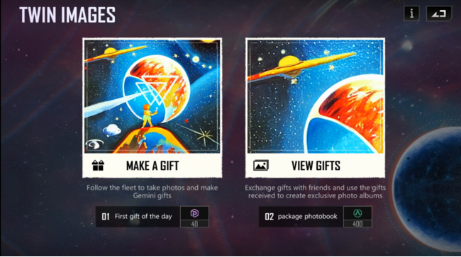 更に、開拓者達は艦隊シェア機能を通じてお気に入りの艦隊写真を撮り、新しいフィルターやステッカーを使い、「双子の映像」に参加できます。写真は全てプレゼントの形で他の星系に送られ、武器技術とプロキシマコインも添付可能です。