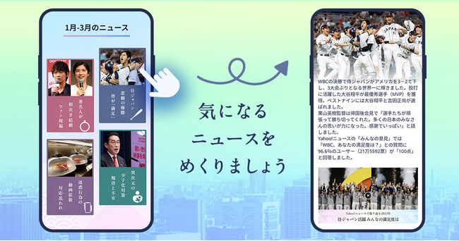 2023年は、野球日本代表による3大会ぶり3回目のWBC制覇や、広島でのG7サミット開催、パレスチナ・イスラエルの交戦など、さまざまなニュースが駆けめぐる年となりました。本特集のコンセプトは「能動的なニュースの振り返り体験」です。普段ニュースに接しているユーザーもそうでないユーザーも、多くの人が一度は遊んだことのあるかるた風「ニュースカード」をめくりながら、1年を振り返ることができる特集です。