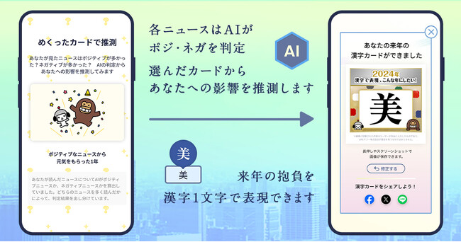 4枚以上のかるた風「ニュースカード」をめくるとニュースがユーザーに与えた影響を測った判定画像が表示され、さらに自身の来年の抱負を表す漢字1文字が記入でき、画像にすることができます。