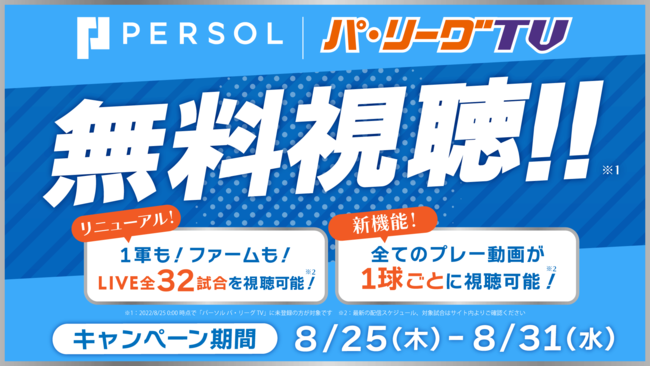 動画配信サービス「パーソル パ・リーグTV」で、2022年8月25日(木)から8月31日(水)の期間において、全ての有料サービスを無料でご利用いただける無料視聴キャンペーンを実施することをご案内いたします。