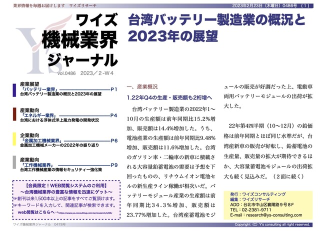 【台湾情報】台湾バッテリー製造業の概況と2023年の展望<ワイズ機械業界ジャーナル2023年2月第4週号発行>