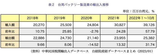 台湾バッテリー製造業の1〜10月の輸入額は前年同期比57.79%増加した。台湾のリチウムイオン電池モジュールの生産拡大に伴い、リチウム電池セルの輸入需要が増え、中国、韓国、日本からの輸入額はそれぞれ前年同期比66%増加、前年同期の3.331倍に増加、前年同期比14.6%増加した。エネルギー貯蔵用リチウム電池の輸入も増えており、台湾当産業の22年第4四半期の輸入額も前年同期比2桁増となる見通しだ。