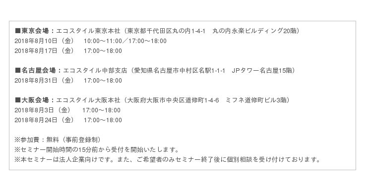 太陽光発電事業を中核とした再生可能エネルギーの普及促進を展開している株式会社エコスタイル(代表取締役社長:木下公貴、本社:東京都千代田区)は、法人施設への自家消費型太陽光発電導入のメリットについて解説する、「脱炭素へ!初期費用0円からの自家消費型太陽光発電導入セミナー」を東京・名古屋・大阪の3会場で開催いたします。