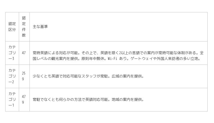 外国人観光案内所認定制度の認定区分と、それぞれ主な基準および全国での認定件数は次の通りです。