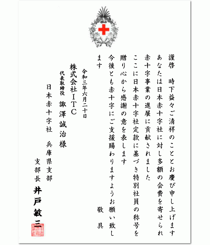 この度、その取組みが認められ日本赤十字社様より特別社員称号を賜りました。