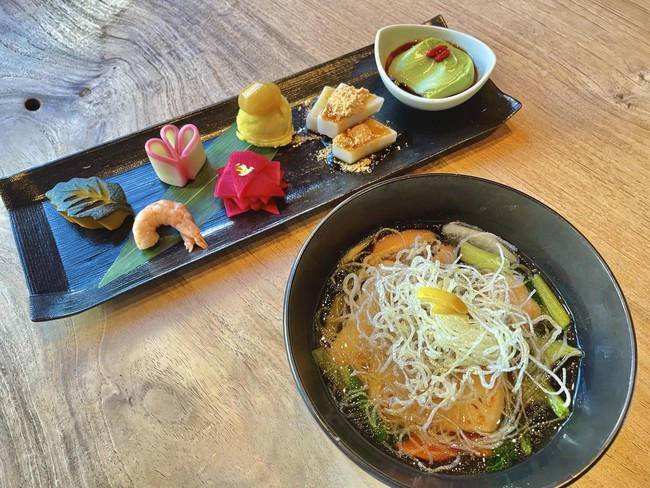 お雑煮はお出汁をきかせた関東風。昆布、椎茸、煮干し、鰹、地鶏といった旨味たっぷりの手作り出汁つゆが魅力です。根菜や鶏肉団子などの具材と、焼いた角餅が2個入っており、トッピングには揚げ春雨と柚子皮を使用。ご自宅で食べるものとはまた違う食感や風味をお楽しみいただけます。