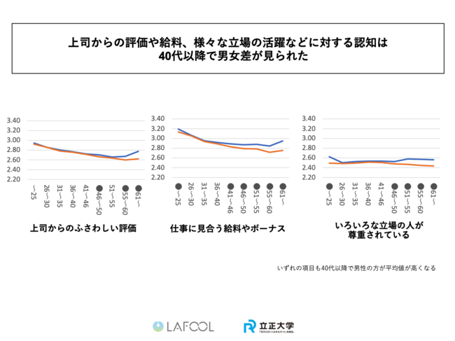 ■上司からの評価や給料、様々な立場の活躍などに対する認知は、40代以降で男女差が見られ、特に「上司からのふさわしい評価」「仕事に見合う給料やボーナス」「いろいろな立場の人が尊重されている」の3項目で、男性の得点が上昇に転じる傾向があった。