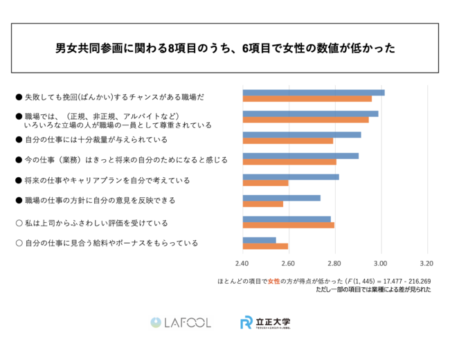 ・男女共同参画に関わる8項目のうち、6項目で女性の数値が低かった