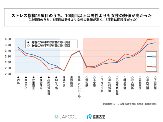 ■ ストレス指標19項目のうち、10項目以上は男性よりも女性の数値が高かった