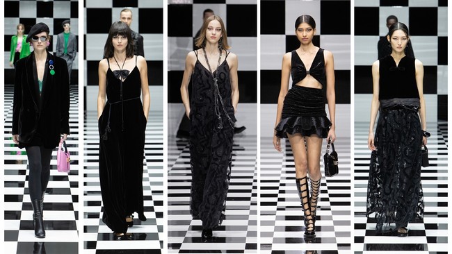 コレクション後半には、イブニングを思わせるような黒のルックが続きます。華やかなミニドレス、ジャンプスーツ、ロングドレスが登場し、素材から放たれるまばゆい輝きとフロスティング効果で、新しい感覚で「グラマー」を表現しています。アクセサリーでは、バックル付きのブーツやレースアップブーツ、メリージェーン風デザインのロングブーツ、鮮やかなカラーリングの小ぶりなバッグなどが登場します。