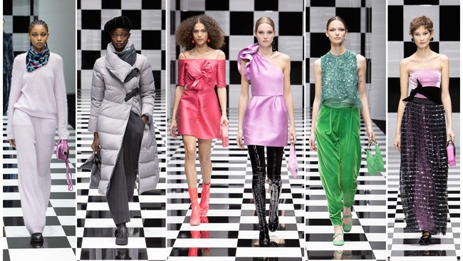 ピンクやグリーン、コーラルなどの明るいカラーパレットが目立ちます。まるで筆で描いたようになだらかな曲線を描くミニマルなフォルムのパンツが登場し、フェミニンな印象を醸し出します。また、ピークトショルダー、胸元の高い位置に配されたボタン、徽章のデザインが特徴的なジャケットが登場し、ユニフォームの世界を優しく、力強く表現しています。それらは、メンズライクなシェイプやデザインを取り入れながらも洗練されたウィメンズウェアへと姿を変えています。また、留め具のバックルデザインが特徴的な極めて軽量なパッファージャケットやパッファーコート、マキシ丈コートといった様々なアウター類に加え、抽象的なモチーフや幾何学的なデザインが描かれた鮮やかな色調のベルベット素材のルックも登場しています。