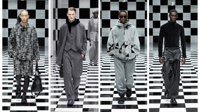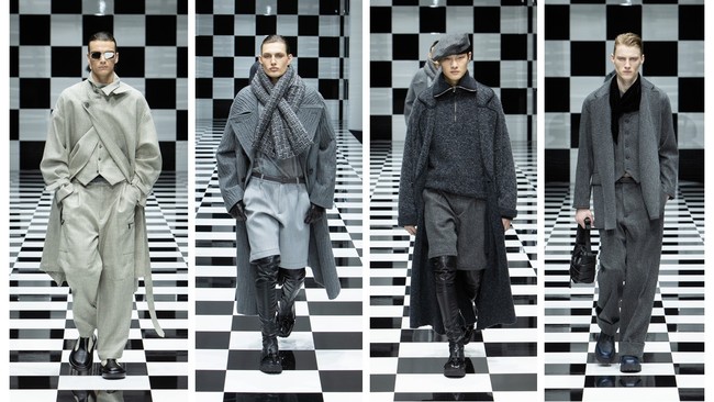 淡い色から濃い色まで、グレーのシンフォニーで構成され、時々グレーと組み合わせて登場する大胆な色彩がアクセントになっています。ワイドラペルとエンボス加工で表現された幾何学模様のオーバーサイズコート、すっきりとしたショルダーラインのジャケット、シープスキンのコートやインレイ仕様のブルゾンなど、細部にまでこだわったデザインが特徴的です。シャツはノーカラーかTシャツのようなデザインで、ジャケットと同じ生地のジレをシャツとして置き換えて、スタイリングされています。ワイドパンツや端正なバミューダ・ショーツは、ハイソックスブーツで合わせて、シルエットをすっきりと見せています。マクロとミクロの幾何学模様パターンが混在し、ベルベットのタッチが夜想曲のようなテイストを添えています。パファー・ジャケットやテクニカルなスキー・スーツ、そして小物には、幾何学模様が繰り返し登場します。靴はハイソックスブーツをはじめとしたミドル丈のブーツが多く使用され、スタイリングの足元を演出しています。