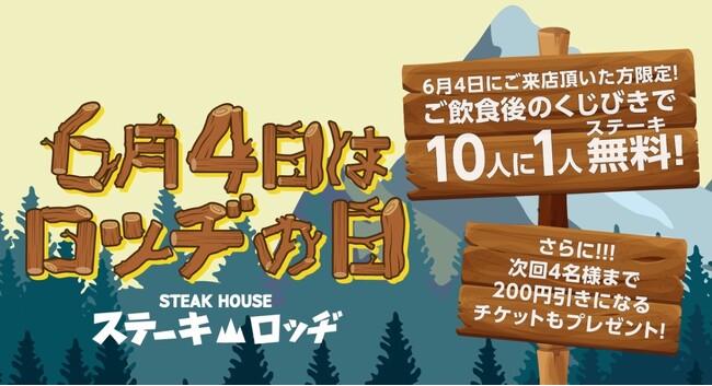 6月4日(日)は「ロッヂの日」!『ステーキロッヂ』各店で、10名に1名が無料になるくじ引きをご用意!さらに、次回ご来店時に使える割引チケットを全員プレゼント!!