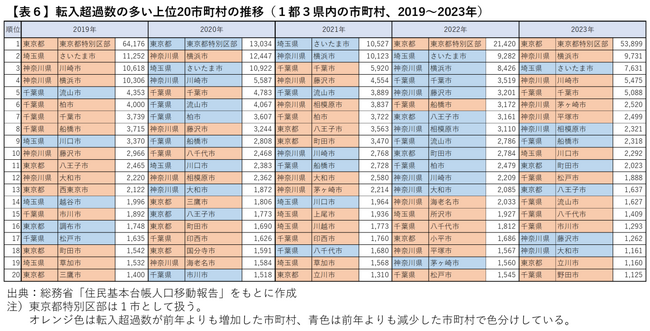 この5年間で東京圏(1都3県)内のどの市町村に人口が集まってきたのか、すなわち転入超過数が多かったのかをみていきます。以下は、2019年から23年にかけての転入超過数が多い上位20市町村の推移の表です【表6】。
