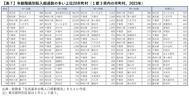 次に、2023年における年齢階級別にみた転入超過数の多い上位20市町村をみていきます【表7】。