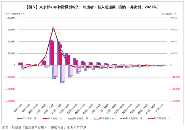 15〜24歳の若い層で女性がより東京都に集まり、30歳代以降の層でも女性の方が東京都により住み続ける傾向にあることが分かります。