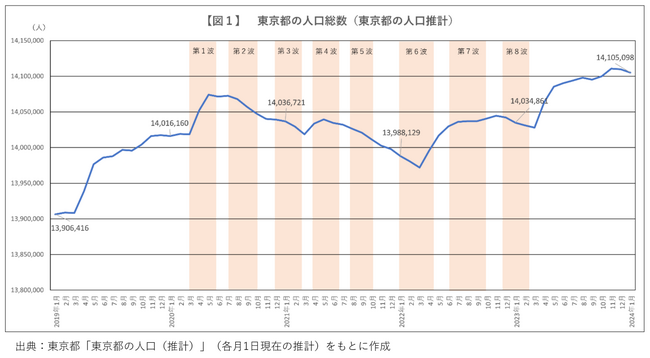 東京都の総人口(「東京都の人口推計」による)は、2024年1月1日現在、前年同月から7万237人増えて1410万5098人となり、過去最多の1410万人台に乗せました。