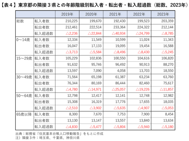 また、この転入・転出超過の推移を年齢階級別にみると、2021年は2019年と比べて、15〜29歳(若年層)で転入超過数が9539人減る一方で(2019年1万3597人→2021年4058人)、30〜49歳(青壮年層)と0〜14歳(子ども層)で転出超過数がそれぞれ2万277人(△4780人→△2万5057人)、4783人(△3713人→△8496人)増えています。コロナ禍において東京都から隣接3県への大幅な転出超過の要因は、若年層の転入超過の低下と青壮年層と子ども層(いわゆる「子育て層」)の転出超過の拡大であったことが改めて認識できます【表4】。