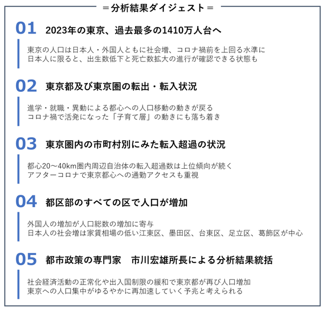 そこで本レポートでは、2023年の東京都及び東京圏、そして東京都区部の人口動向を詳しく分析するとともに、コロナ流行前(2019年)、コロナ禍(2020〜2022年)、アフターコロナ(2023年)の5年間の人口の推移について総括していきます。