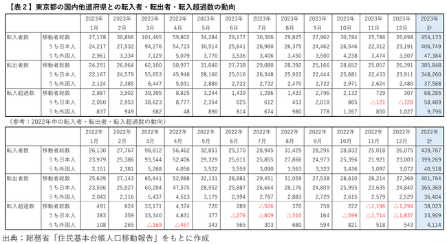 東京都の国内他道府県との転入・転出状況をみると、年間の転入者数は45万4133人、転出者数は38万5848人で、6万8285人の転入超過となりました。転入超過数は2022年から3万262人増え、2年連続で前年を超えています。月別でみても、3月に3万9305人、4月に8825人の大幅な転入超過となり、すべての月で転入超過が続きました【図2、表2】。