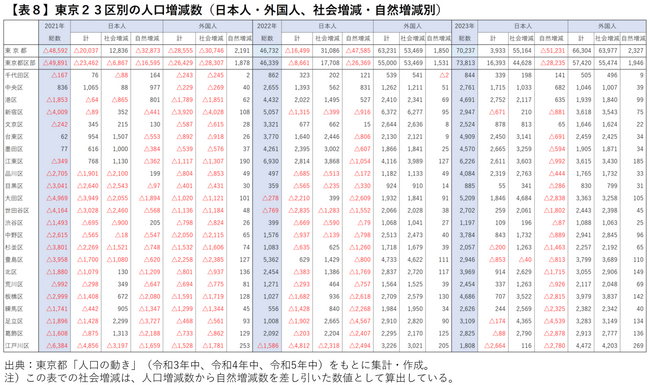 東京都区部全体では、2021年に総数で4万9891人の減少を記録しましたが、2022年に4万6339人の大幅増加に転じ、2023年には7万3813人の増加となりました。その内訳を日本人・外国人別にみると日本人が1万6393人増、外国人が5万7420人増と、外国人の人口増加が大きく寄与していることが分かります【表8】。