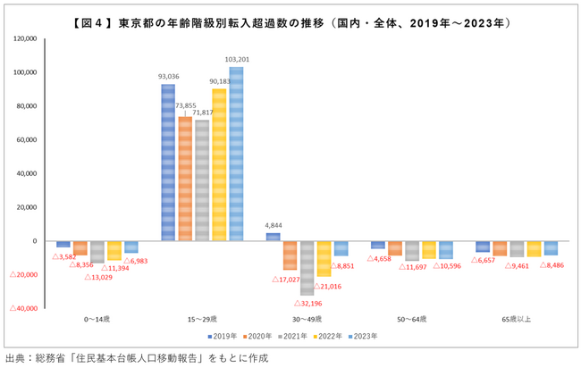 コロナ流行前、コロナ禍、アフターコロナの5年間の推移をみると、流行前2019年には転入者数46万6849人、転出者数38万3867人で、8万2982人の転入超過でしたが、コロナの感染拡大により転入者数の減少、転出者数の増加が顕著になり、コロナ禍ピーク2021年には転入者数42万167人、転出者数41万4734人となって転入超過数は5433人まで激減しました。2022年以降ようやく転入者数、転出者数とも回復傾向が見られ、2023年の転入超過数は流行前の8割程度の水準まで回復するに至っています【図3】。