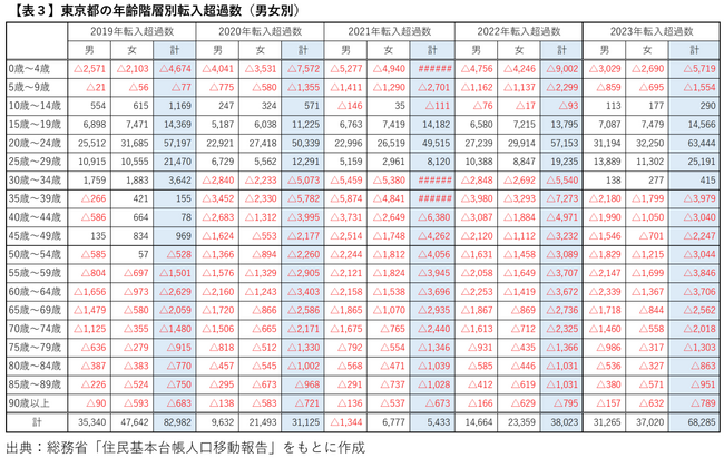 この東京都の転入・転出状況を年齢5歳階級別・男女別にみていきます【表3】。