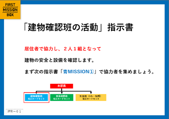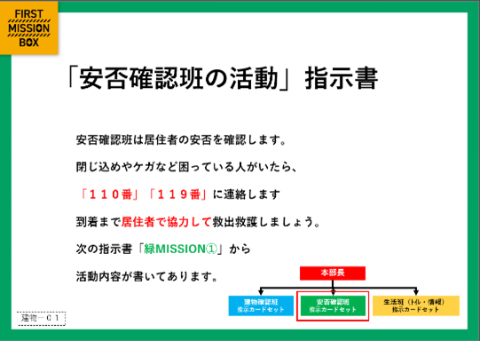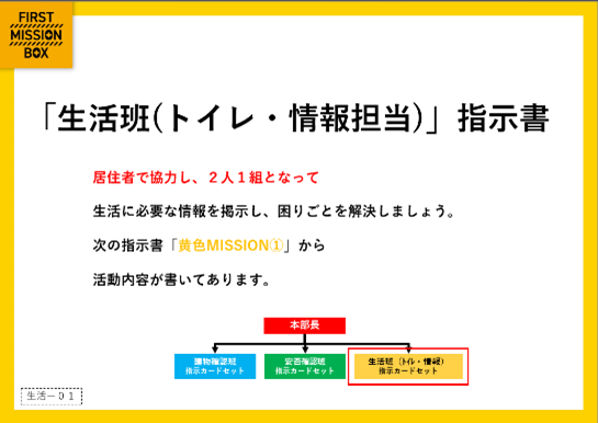 カードは、マンション全体の統率を取る「本部班」、建物の破損状況を確認する「建物確認班」、居住者の安否確認・救助を行う「安否確認班」、トイレ運用や防犯対策など被災生活を安全に過ごすことができるよう基盤を整える「生活班」の4つの班で構成されています。本部班を中心に、各班が連携して動く仕組みになっています。