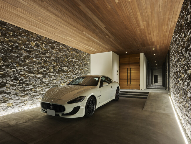 〜インパクトのある外壁が絵画のようにガレージと車を切り取る。外に開かれた「魅せるガレージ」