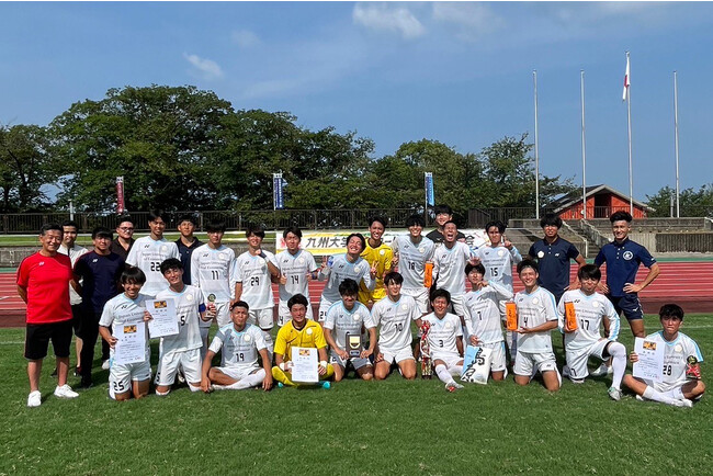 九州大学サッカートーナメント大会は九州・沖縄の大学20チームが参加して行われ、長崎県の島原市営陸上競技場で開催された決勝では鹿屋体育大学に2-1で勝利しました。個人賞では、最優秀選手に健康スポーツ経営学科4年で主将の半田勘太郎さん(金光大阪高校出身)が、最優秀新人賞に同1年の後藤颯汰さん(國學院栃木高校出身)が選出されました。