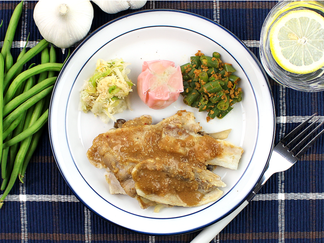 副菜は、細切りの白菜とツナを合わせた白菜のサラダ、ピンク色の皮でタラとエビのすり身を包んだシューマイ、ピリ辛のインゲンのそぼろあえです。