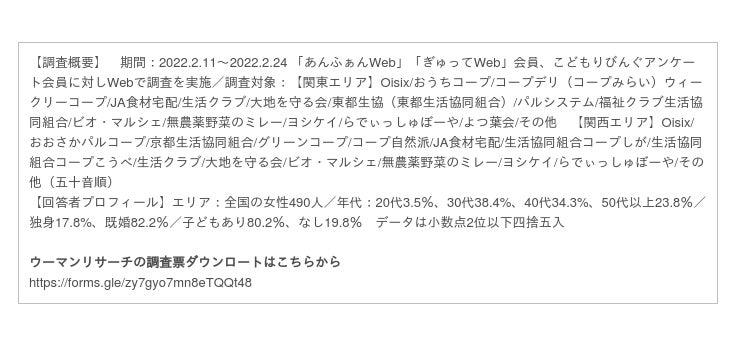 園児とママの情報誌「あんふぁん」「ぎゅって」を発行する株式会社こどもりびんぐ(所在地:東京都千代田区、代表取締役:中島一弘)は、「シルミル研究所」としてリサーチ事業を展開しています。「シルミル研究所」では、女性を対象にした調査「ウーマンリサーチ」を実施し、女性が選ぶおすすめの商品やサービスをランキング形式で、Webコンテンツとして発信しています。今回は2022年2月に実施した「食材宅配サービス」についての調査結果を発表いたします。
