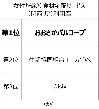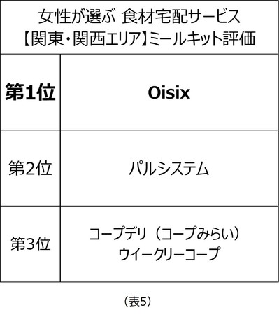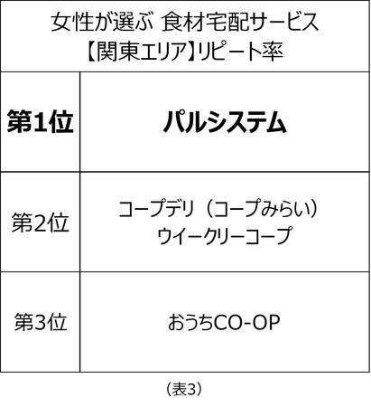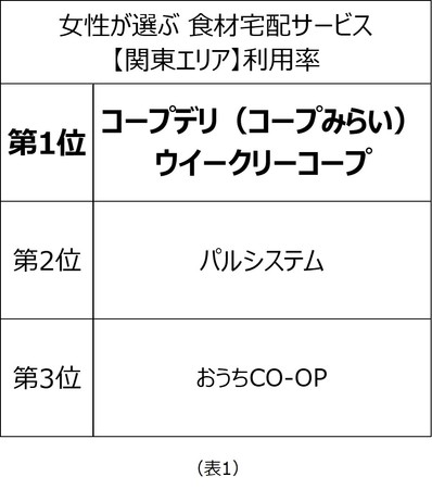 2022年2月に実施した調査において、関東エリアでは「コープデリ(コープみらい)ウイークリーコープ」が利用率第1位、「おうちCO-OP」が総合満足度第1位、「パルシステム」がリピート率第1位となりました(表1〜3)。関西エリアでは「おおさかパルコープ」が利用率第1位に(表4)。また、関東・関西エリアのミールキット評価では「Oisix」が第1位となりました(表5)。