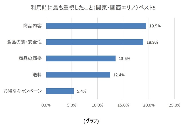 また、関東・関西エリアのサービス利用者に、利用時に最も重視したポイントについて聞いたところ、「商品内容」が19.5%と最も多く、「食品の質・安全性」、「商品の価格」と続きました(グラフ)。