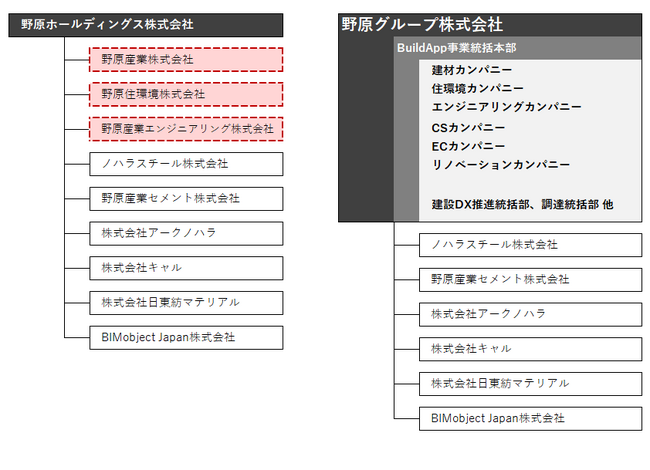 「BuildApp事業統括本部」には、野原ホールディングスの「CSカンパニー」、「ECカンパニー」、「リノベーションカンパニー」と、野原産業、野原住環境、野原産業エンジニアリング各社がそれぞれ「建材カンパニー」、「住環境カンパニー」、「エンジニアリングカンパニー」として「BuildApp事業統括本部」の直下組織となる。