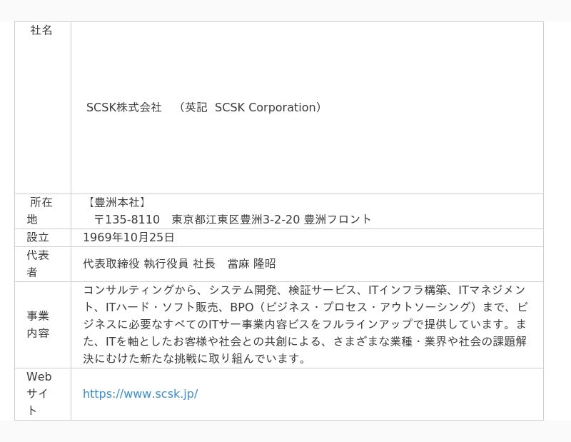 SCSK株式会社は、コンサルティングから、システム開発、検証サービス、ITインフラ構築、ITマネジメント、ITハード・ソフト販売、BPO(ビジネス・プロセス・アウトソーシング)まで、ビジネスに必要なすべてのITサービスをフルラインアップで提供しています。また、ITを軸としたお客様や社会との共創による、さまざまな業種・業界や社会の課題解決にむけた新たな挑戦に取り組んでいます。