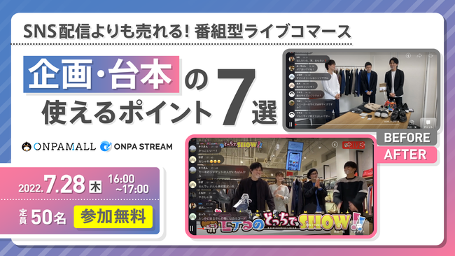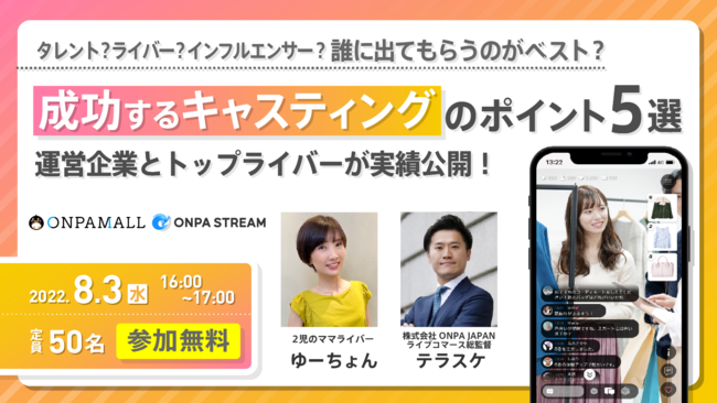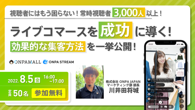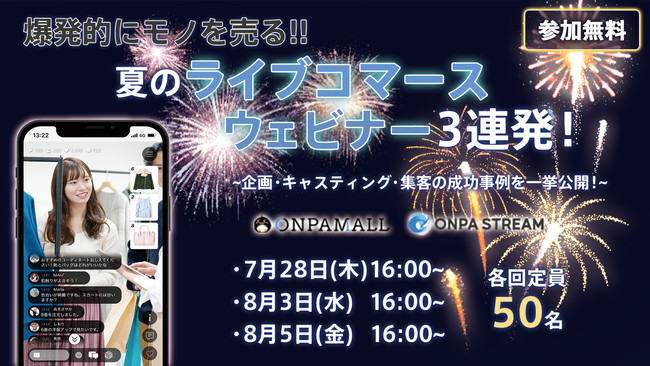 株式会社ONPA JAPAN(東京都渋谷区、代表取締役:恩地 佑亜 /以下、ONPA JAPAN)が無料ウェビナーを開催いたします。ライブコマースに興味のある方や新たな販売方法をご検討中の企業様向けのウェビナーです。
