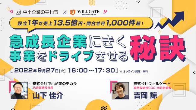 株式会社ウィルゲート(本社:東京都港区、代表取締役:小島 梨揮)は、中小企業支援(ブランディング、WEB マーケティング、SDGs支援)事業を行う株式会社中小企業のチカラ(本社:東京都渋谷区、代表取締役社長:山下 佳介)と合同で、『設立1年で売上13.5億円・問合せ月1,000件超!急成長企業にきく事業をドライブさせる秘訣』をテーマにしたオンラインセミナーを9月27日(火)に開催いたします。(申し込み先:https://bit.ly/3xpiLUf )