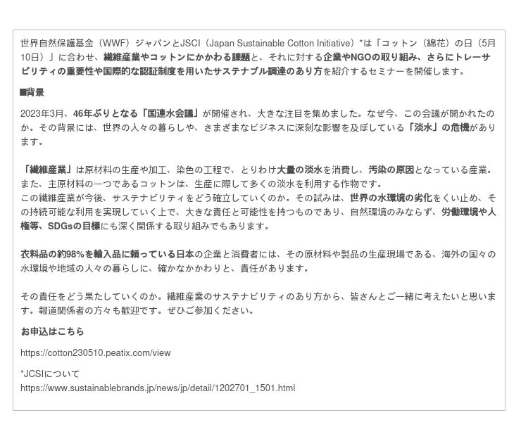 世界自然保護基金(WWF)ジャパンとJSCI(Japan Sustainable Cotton Initiative)*は「コットン(綿花)の日(5月10日)」に合わせ、繊維産業やコットンにかかわる課題と、それに対する企業やNGOの取り組み、さらにトレーサビリティの重要性や国際的な認証制度を用いたサステナブル調達のあり方を紹介するセミナーを開催します。