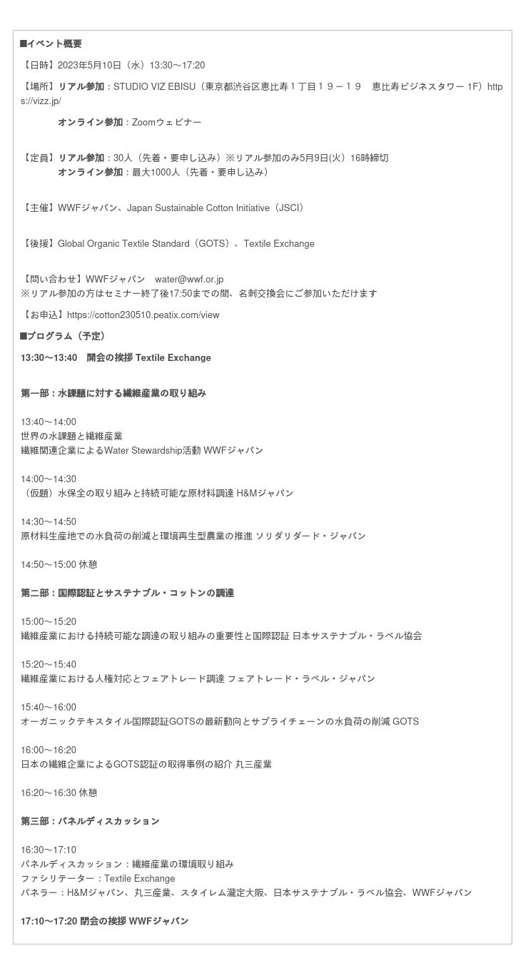 5月10日(コットンの日)WWF・JSCI共催セミナー繊維産業に求められるサステナビリティとは?〜水リスクとコットンについて考える〜