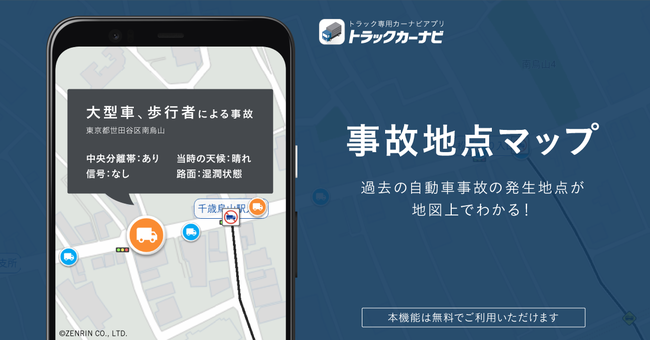 株式会社ナビタイムジャパン(代表取締役社長:大西 啓介、本社:東京都港区)は、2022年8月30日(火)より、トラック専用カーナビアプリ『トラックカーナビ』にて、過去に自動車事故が起きた場所を地図上で確認できる「事故地点マップ」を提供開始いたします。本機能は無料でお使いになれます。