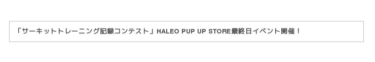 「スペシャルチャンス!HALEO POP UP STOREのSTAFFより良い記録を出した方へ、HALEOからスペシャルプレゼントがございます!」 体力のある方、是非チャレンジ、ご参加ください。