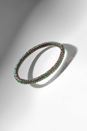ホワイトゴールドにオニキス、オパール、トルマリン、エメラルドをびっしりとあしらった、魅惑的なニュアンスの色合いで輝くネックレスは、素肌に直接身に着けるために、ティモシーにぴったりとフィットするように制作されています。